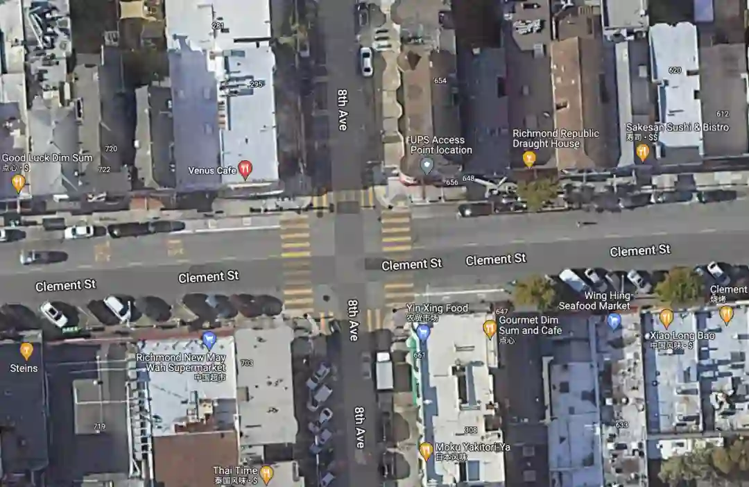 事发地点根据视频中的茶餐厅汉字标牌可以判读出,是在美国旧金山里士满区的第二唐人街、Clement路与第8大道的交叉十字路口,也就是卫星地图显示的左上角那个位置。