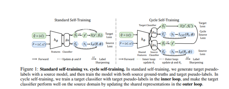 最近,自训练(Self-training)方法开始被应用到领域自适应问题中。自训练作为半监督学习(Semi-supervised Learning)中的主要方法,先在有监督数据上训练模型,再生成无监督数据的伪标签(Pseudo-labels),最后用真标签和伪标签来共同训练模型。然而在领域自适应问题中,自训练的伪标签会因为源领域和目标领域的分布偏移而变得更加不准确,直接使用全部伪标签将造成误差累积。之前的工作采用可信度阈值(Confidence Threshold)来筛选可靠的伪标签或者给可靠的伪标签更大的权重,然而这类方法不但需要对不同的任务大量调节阈值,而且仍然无法保证分布偏移条件下伪标签的可靠性。