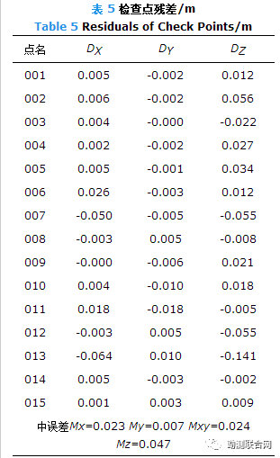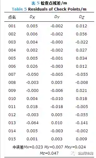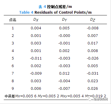 从空三加密检查点残差表 5中得出:平面中误差Mxy=0.024 m, 高程中误差为Mz=0.047 m,空三加密的精度满足低空摄影测量内业规范[15]的精度要求。个别检查点相比其他点出现误差较大的原因可能是:飞行姿态稳定性差影响了数据处理的精度;外业采集地物坐标时仪器位置不准确;内业空三加密人员操作不熟练,没有准确找到加密点的合理位置。