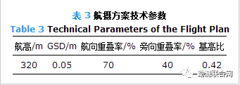 按照航空摄影的一般规定,航飞的航向重叠度为60%,最小不得小于53%;旁向重叠度为30%,最小不得小于15%[14]。本次航飞试验考虑到外界环境以及飞机性能对航飞数据的影响,航飞方案技术参数如表 3所示。