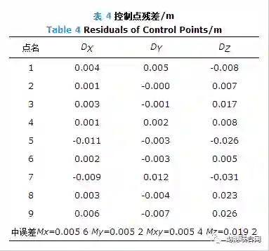 该测区根据像控点进行空三加密,通过严密光束法平差后,对加密点平面和高程精度及相关误差进行统计,如表 4、表 5所示。