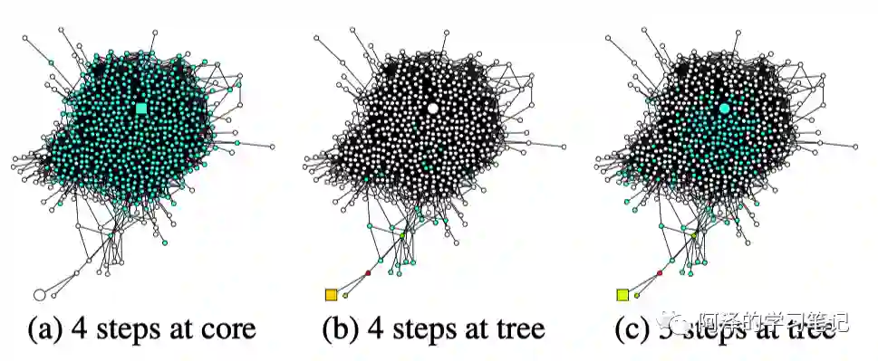 我们可以从(a)中看到,处在中心节点位置的正方形节点经过 4-step 就可以涵盖整个图;而(b)中,处在边缘节点位置的正方形节点,经过 4-step 仅仅扩展了一小部分,经过 5-step 达到核心后才迅速蔓延。