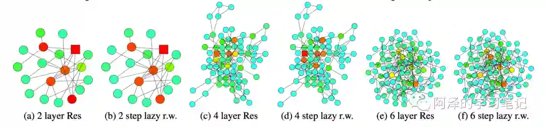 回顾我们看到的第一场图,如果 GCN 使用相同的层数,其与施加固定 step 的随机游走会有相同的效果。相同的层数可能会导致中心区域的节点表示失去局部信息,但却会让边缘节点探索到其周围的局部信息。