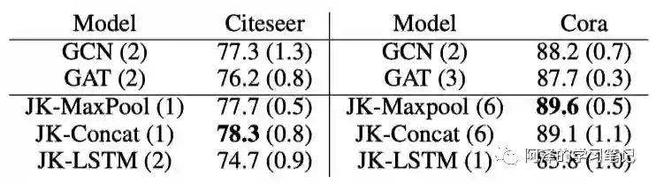 下图为不同模型在不同数据集中的表现,其中 JK-Net 基于 GCN 模型。LSTM 效果不好主要是因为数据集太小了: