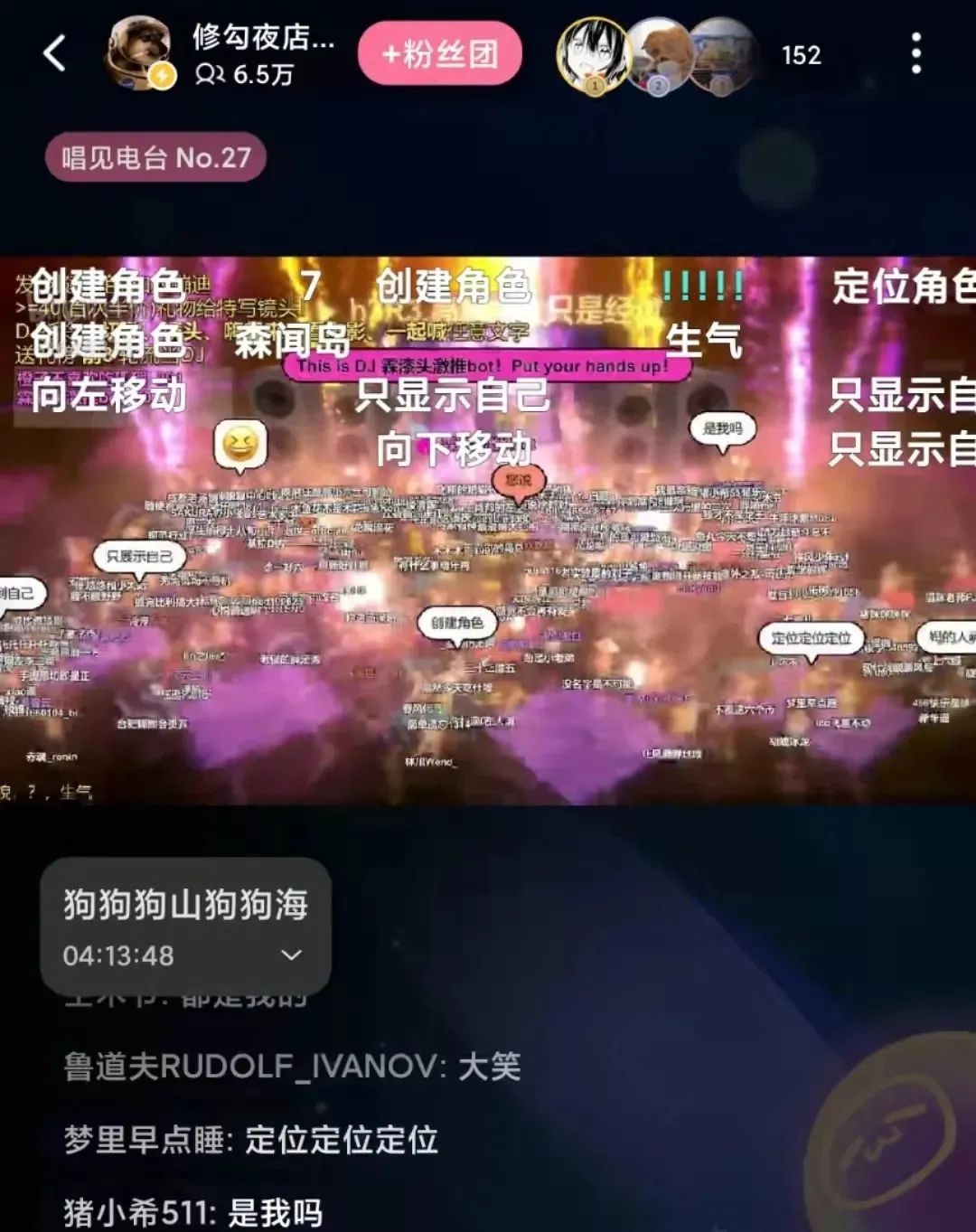 打开B站的直播页面,搜索“修勾夜店”,每天夜里,数万人化身小狗“cheems”在舞池中摇摆,只要在弹幕中发布“移动、停下、大哭”等指令,你的修勾就能做出相应的举动,而财大气粗的打赏玩家更能登上DJ台,一条“一起喊任意文字”指令发布,你就能体会一把“全场买单”的极致快感。