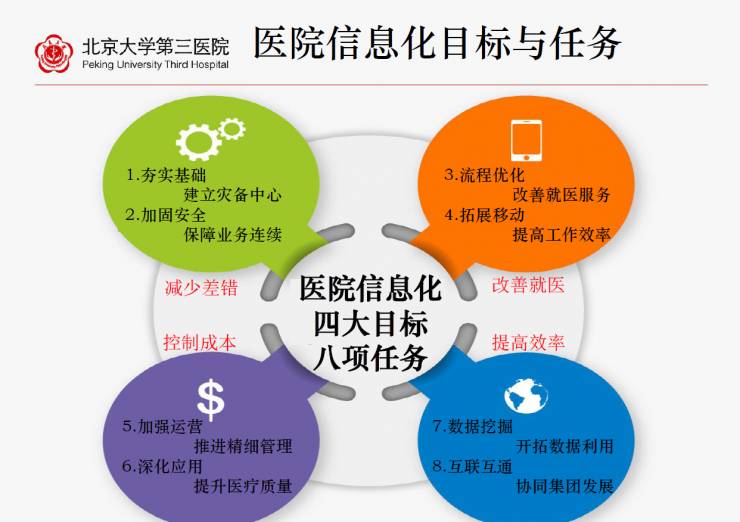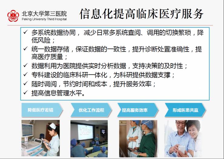 电子病例方面,北京大学第三医院从2008年上EMR电子病例,2010年上临床路径,2014年推移动,再到2015年集成平台数据中心,2016年数据平台挖掘应用,2017年是科研大年。