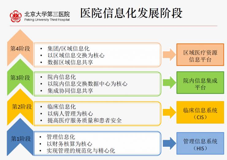 第一个阶段就是管理信息化(HIS),北京大学第三医院1998年做HIS,而在一年后就做了CIS。这些都是以病人为中心,代表EMR电子病例为核心的临床信息化,为患者服务来提高医疗质量和患者的安全。
