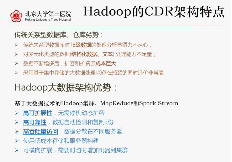 因为其他传统型数据中心不能够满足这种大数据的处理,北京大学第三医院也第一次尝试在医疗、医院建立基于Hadoop这种大数据技术的实时数据中心,通过集中平台实时传送存储数据中心。至于为何选择Hadoop,主要出于它可高效处理海量数据。