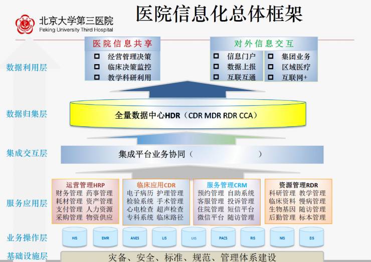 以北大第三医院为例,各部门和业务之间的协同、数据的互联互通、整体的数据挖掘应用,这么多底层系统到底该怎么做?
