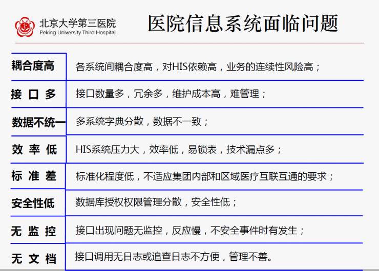 北京大学第三医院梳理了424个接口,发现只有275个是有效的。因为上线将近20年,很多无效的接口还残存着,通过数据接口,其实那些可以不用的,通过上线很多接口都停掉了。