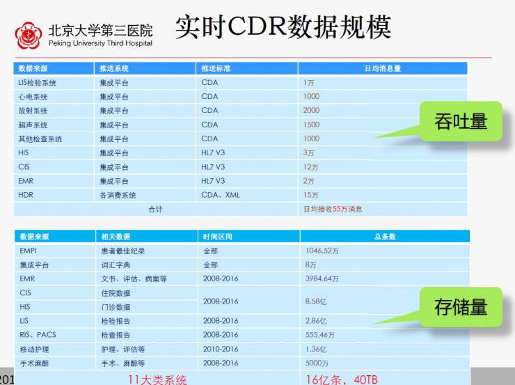 目前北京大学第三医院吞吐量的确日均接收55万这和总存储40个TB这么高的量级。