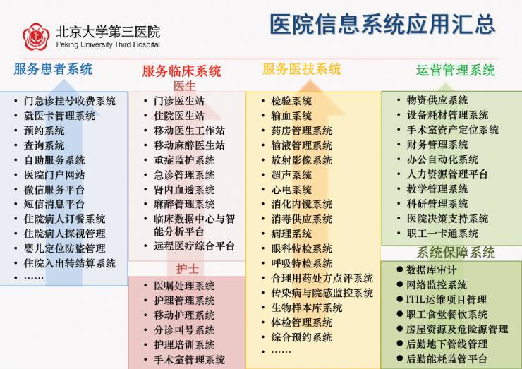通常情况下,医院信息系统应用可汇总为四大主线:服务患者系统、服务临床系统、服务医技系统、运营管理系统。