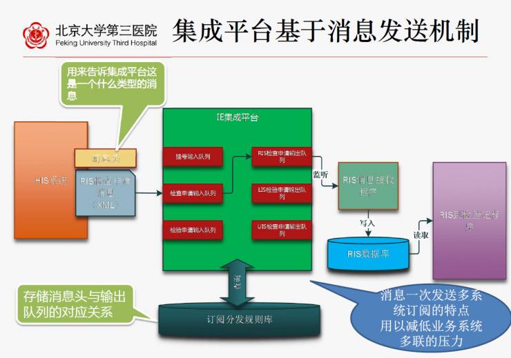 同样,现在的集成平台就是这个道理,基于消息发送,我只发送一次,需要的消费系统我就要订阅一下,所有的数据一致性,以及我们的信息工作人员以前上线首先就要跟HIS接,上线一个新系统先要获取病人的信息,HIS的业务量是最繁忙的,上了平台以后发现的确减压最大的就是HIS,上哪个系统都要跟HIS接一遍,接HIS,接EMR,接LIS、RIS等,一切系统都要接一遍才能上线。