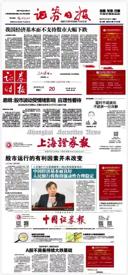 今天一早,四大证券报(《中国证券报》《上海证券报》《证券时报》《证券日报》)更是集体为A股站台,头版都是“A股不具备大跌基础”等变着法儿给股市打气的标题。