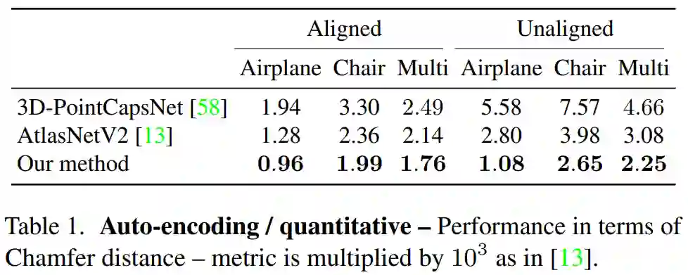 定性分析的结果,研究者给出了基于分解的 3D 点云重建方法以及 3D-PointCapsNet [58]、AtlasNetV2 [13] 的重建结果。