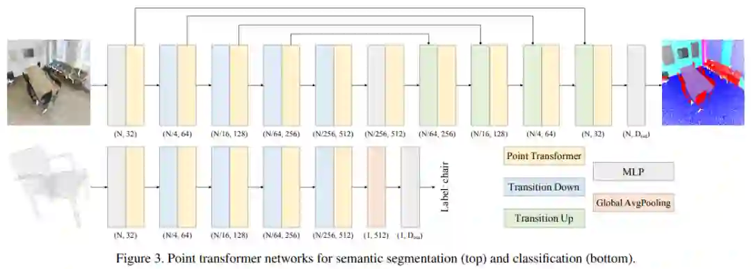 用于语义分割(上)和分类(下)的 Point transformer 网络。