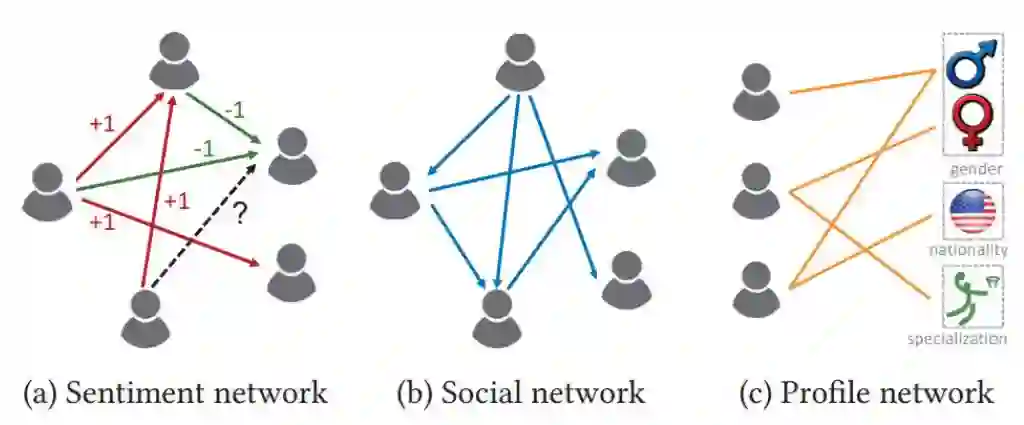 预测微博用户对名人的情感所使用的三个网络结构示意图。从左到右分别为:(a)情感网络 (交互图);(b)社交网络;(c)知识图谱。