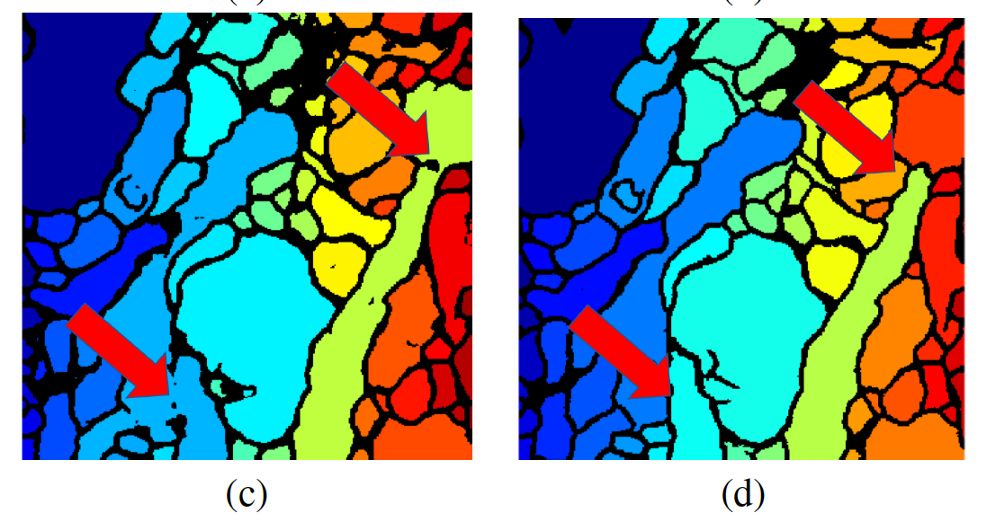 (c)使用像素级丢失检测神经元膜后获得的分割,(d)利用拓扑损耗检测细胞膜后得到的分割