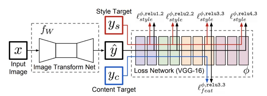 已经发现,CNNs在较高的层次上捕获内容的信息,而较低的层次更关注单个像素值。因此,我们使用一个或多个CNN顶层,计算原始内容图像(C)和预测输出(P) 的激活图。同样,通过计算预测图像(P)和风格图像(S)的下一级特征图的L2距离,可以计算出风格损失,得到的损失函数定义为: