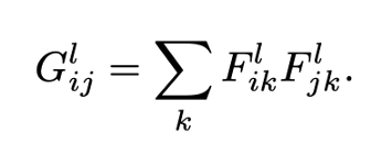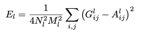这里,G^l^和A^l^分别是模型输出的l层和目标图像的l层的风格样式表示。N~l~是层l中不同特征映射的数量,M~l~是层l(i)中特征映射的容量(也就是通道的宽和高)。最后,E~l~是图层l的纹理损失。