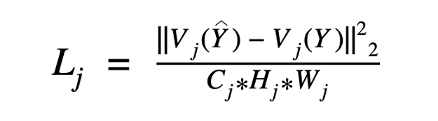 其中,V_j(Y)表示VGG网络第j层在处理图像Y时的激活情况,其形状为(C_j, H_j, W_j)。我们使用L2损失的平方,根据图像的形状归一化,比较了ground truth图像Y和预测图像Y^的激活情况。