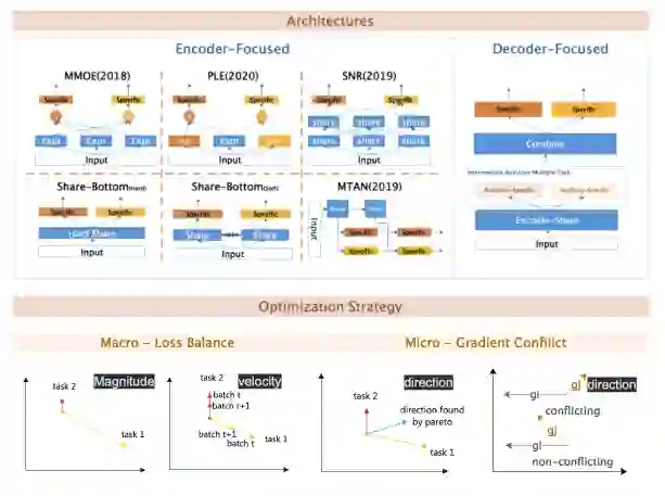 多任务多目标出现跷跷板、负迁移现象,微观的梯度冲突是本质。不论是从Architecture 还是 Optimization strategy两个维度来优化升级,殊途同归,都是要缓解冲突,减少多任务间的内耗。