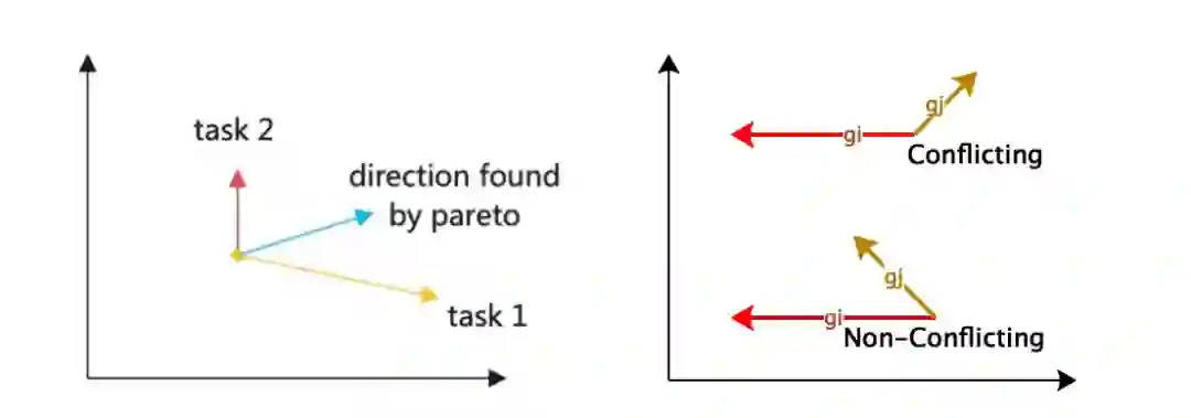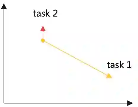 首先通过cosine相似度来定义两个任务在共享参数上是否是冲突的,如下图,conflicting是夹角大于90度,non-conflicting是小于90度。