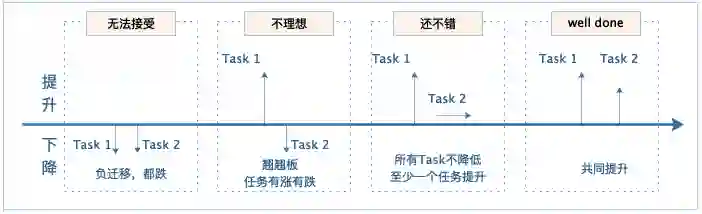 多目标共同学习的结果,有4种状态,如下示意图。“well done”: 最好的状态,所有share任务实现共同提升。“还不错”:其次的状态,所有任务不降低,至少一个任务提升。如果是主任务 + 辅助任务的搭配,能够实现牺牲辅助任务达到主任务提升的效果,也是well done。“不理想”:跷跷板现象,任务有涨有跌。“无法接受”:负迁移现象,所有任务都不如从前。