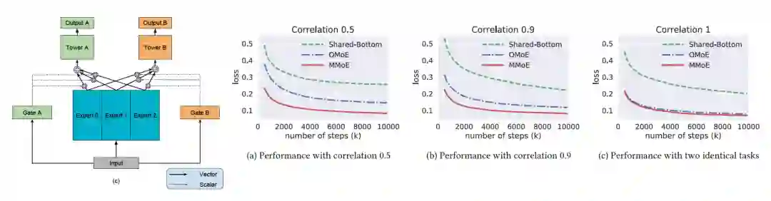 这个文章中,有一个非常有意思的做法:人工控制两个任务的相似度,然后观测不同网络结构在不同任务相似度的表现效果。得出一个结论:MMoE在多任务之间的的相关性( relatedness )比较低的时候,效果也能很不错。