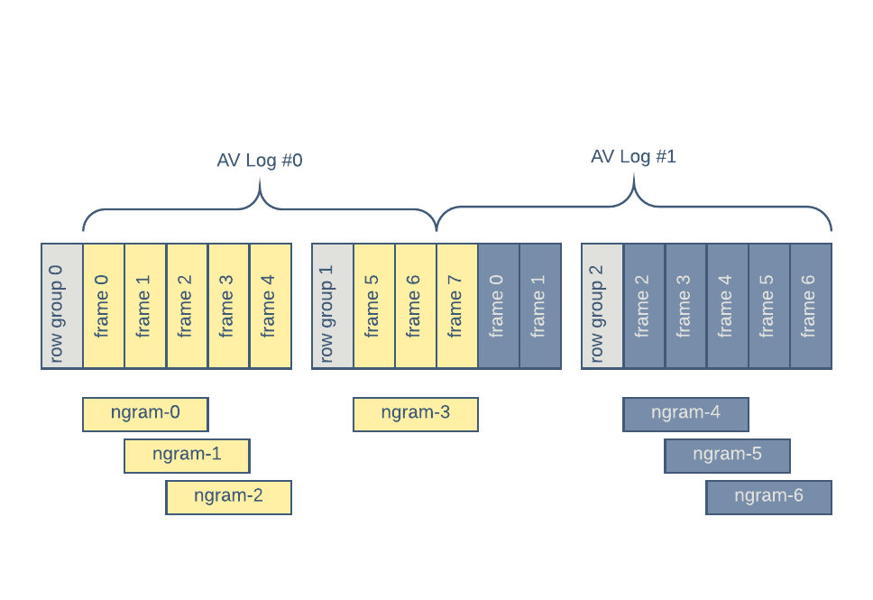 下图显示了长度为 3 的 n-gram 的分组。AV Log#0 和 AV Log#1 表示两种不同的车载记录:
