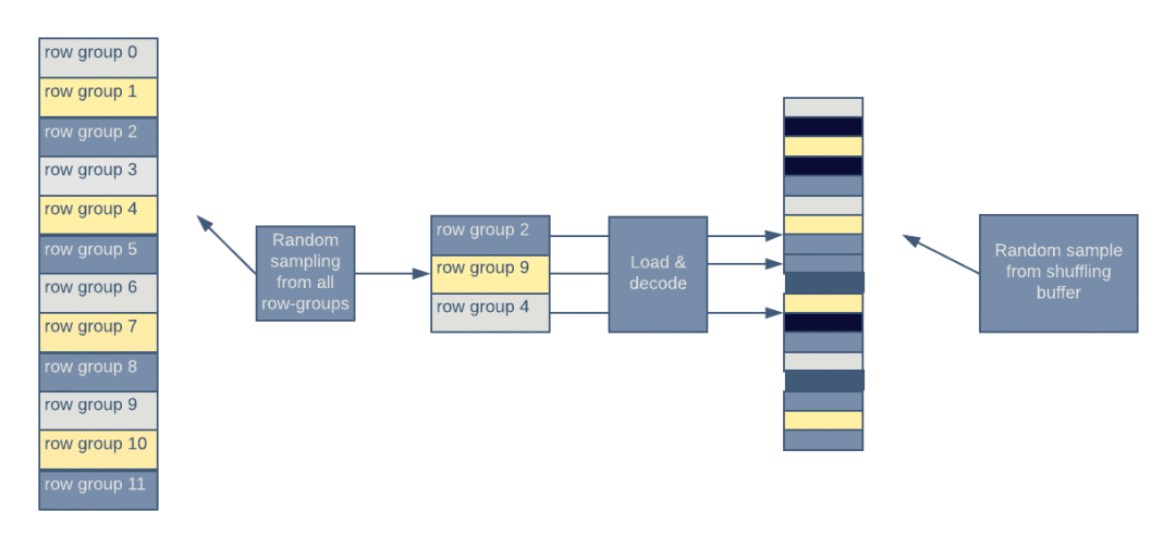 图 4:通过随机选择要加载的行组,然后将个体样本放入内存 shuffle 缓冲区来实现 shuffle。