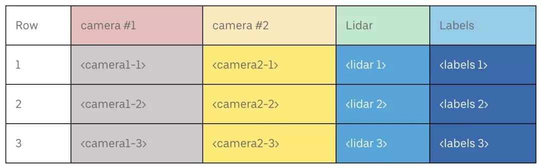 列式数据存储按照列(而不是行)的顺序来组织数据。例如,从自动驾驶车辆传感器记录的数据可能看起来像这样: