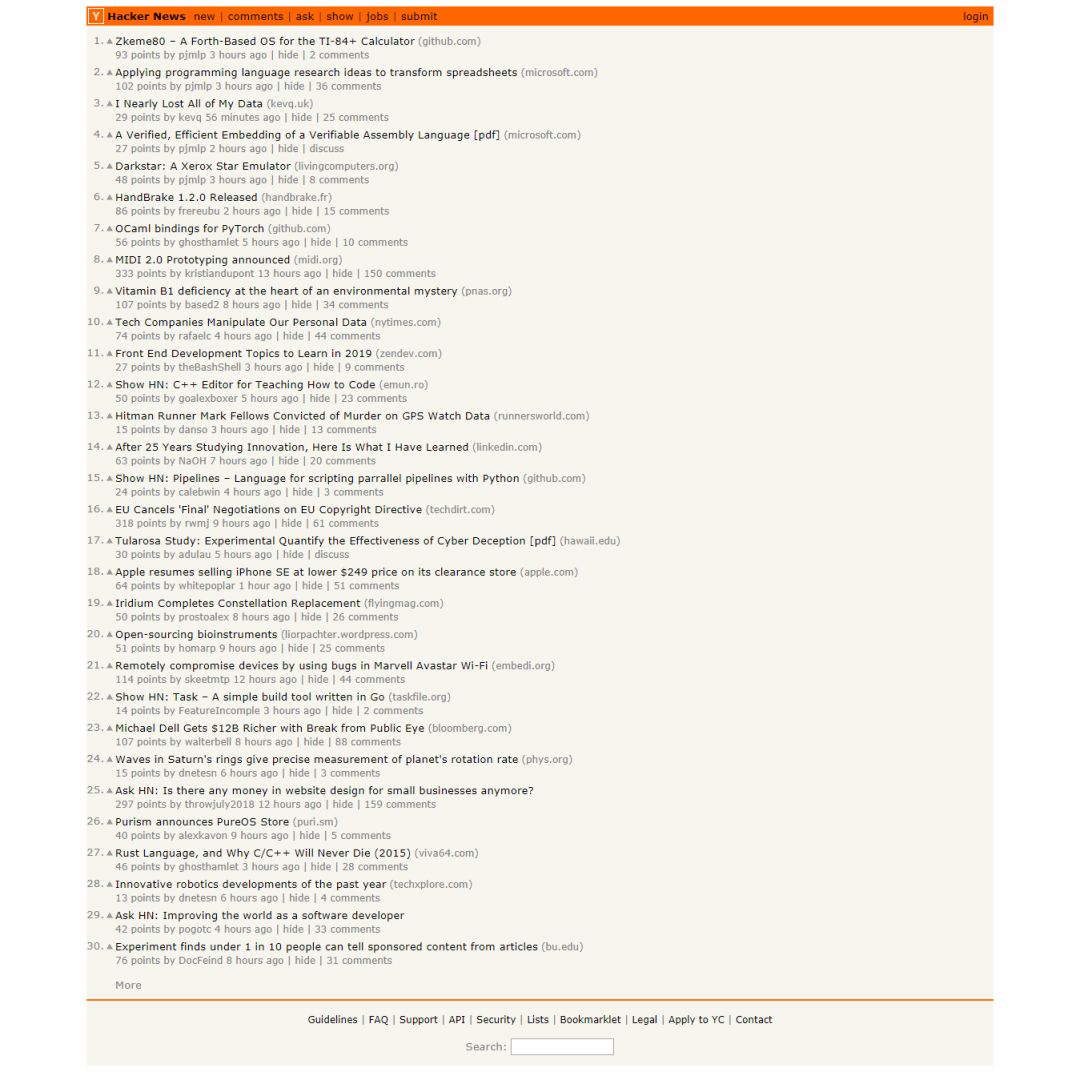 先上一张 Hacker News 最新的首页截图,感受一下万年不改的上世纪风格 UI ↓↓↓