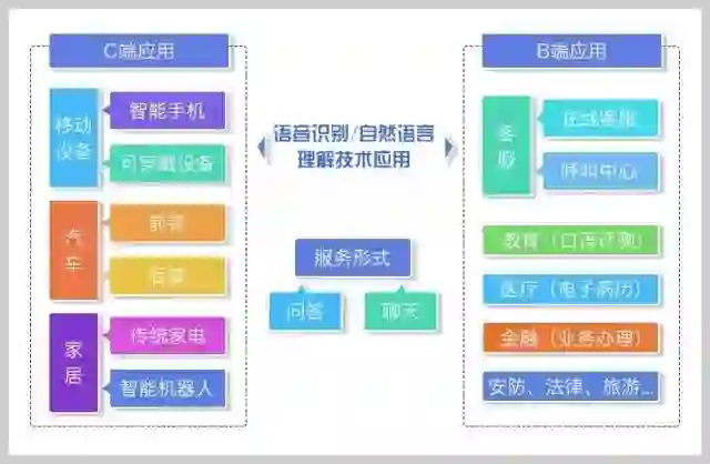 以问答和聊天为服务形式,智能语音语义在多个使用场景和行业领域都有广泛应用,我们可以简单从C端和B端两个方向分别来看。