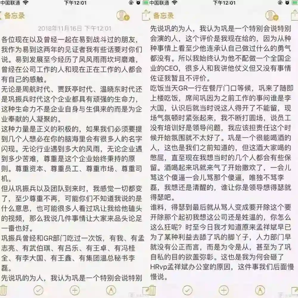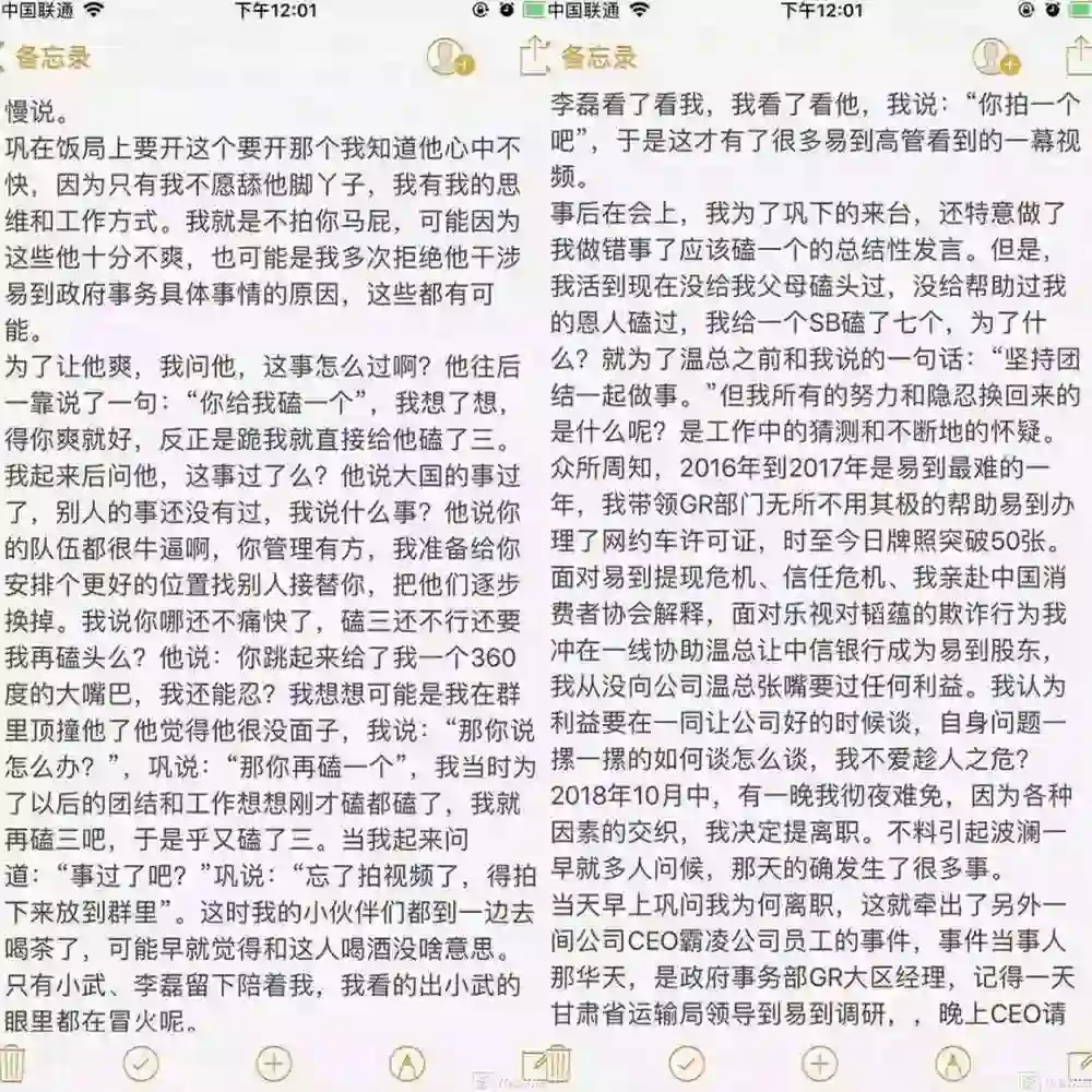 这名内部人士的版本是:吕艺为易到GR部门负责人,因为之前和巩振兵有些工作上的矛盾,所以几个月前,GR部门的员工请巩振兵吃饭喝酒,“相当于吃了这顿饭,大家一笑泯恩仇”。当晚巩振兵被灌醉,“吕艺说要磕头拜大哥,以后就是好兄弟了,因为巩振兵喝多了瘫在那里,神志也不是很清醒,所以就也没有阻止”。