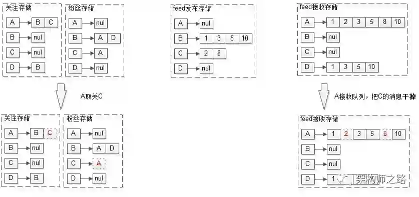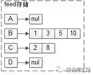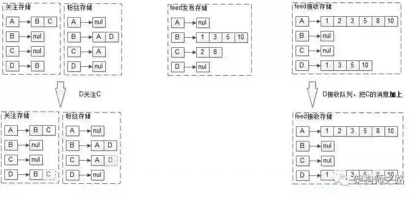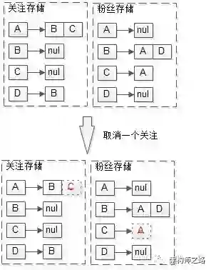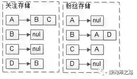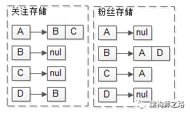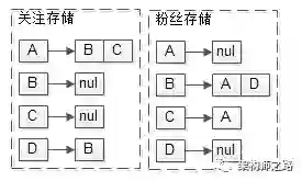 其关系存储又包含关注关系与粉丝关系,“A关注了BC,D关注了B”的潜台词是“B有两个粉丝AD,C有一个粉丝A”。