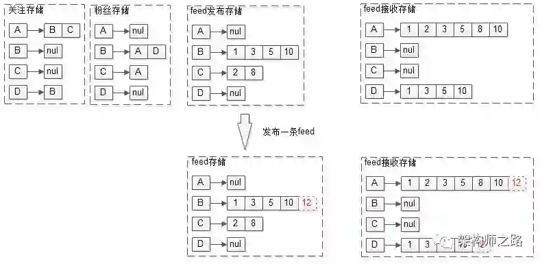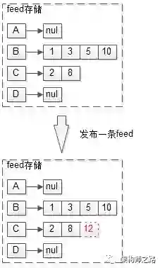 画外音:feed业务是典型的读多写少业务场景,读写比甚至高于100:1,即平均发布1条消息,有至少100次阅读。