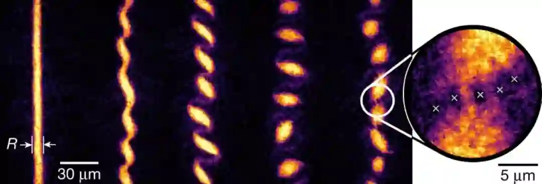在这项研究中,作者首先把「玻色—爱因斯坦凝聚态」拉伸成细长条状,然后旋转这根细条直至细条破裂。这些操作得到的结果是一系列子涡旋,每一个子涡旋都是母涡旋的迷你版。