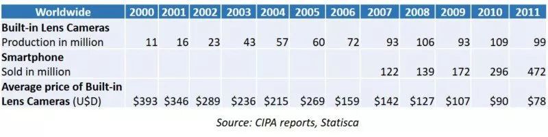 2003年,拍照手机在全球的销量超过了数码相机,智能手机的销量增长速度远快于人们对相机的需求。正如柯达首席执行官在2006年所说的,这是一个“蹩脚的业务”。2000年数码相机的平均价格是393美元,到2012年这个数字跌至78美元。