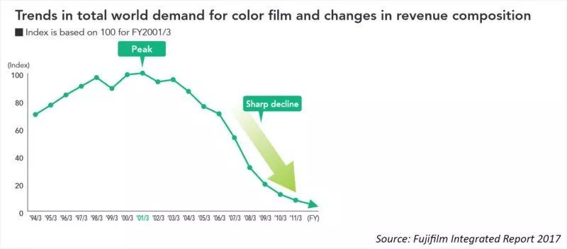 2001年,全球胶片的销量达到了顶峰,但正如富士胶片公司总裁回忆的那样:“巅峰背后总是隐藏着一个危险的山谷。”首先,市场开始缓慢地萎缩,然后不断加速,最后以每年20%或30%的速度暴跌。2010年,全球对摄影胶片的需求下降到不到十年前的十分之一。