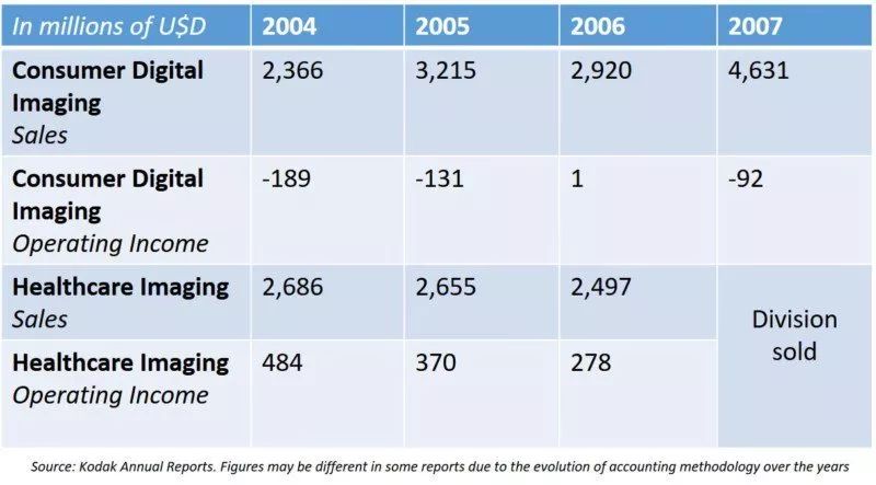 这个问题在财务报告中很明显。尽管2000年柯达的摄影部门有14亿美元的营业收入,但利润很快就消失了。