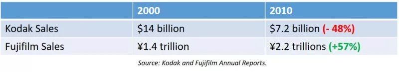 2000年,就在数字转型之前,与胶片相关的销售额占柯达收入的72%,占其营业收入的66%,富士胶片的比例则分别是60%和66%。