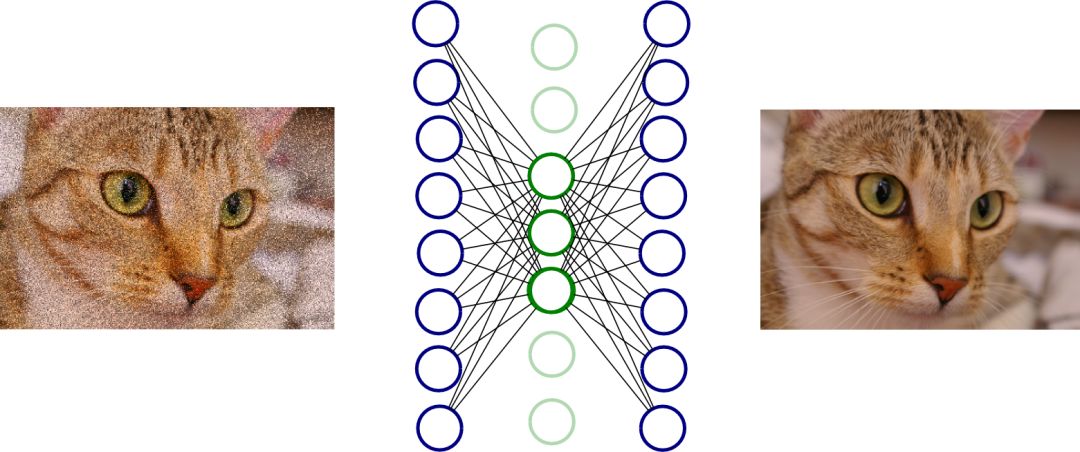 去噪自编码器图示。使用神经网络重建左侧图像,生成右侧图像。在此示例中,绿色的神经元就是 bottleneck 层。(图片来源:http://www.birving.com/presentations/autoencoders/index.html#/)