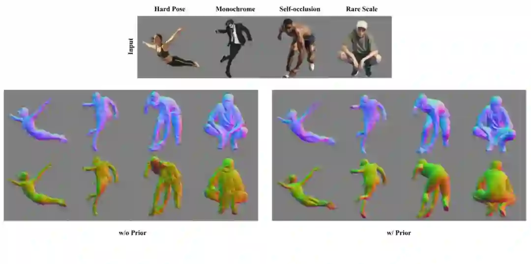 有了 SMPL body(左边,w/ Prior)的加持,clothed normal 预测更准确。