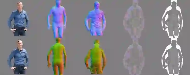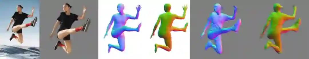 ICON 在思路上借鉴了很多相关工作,比如 PIFuHD 里面的法向图(Normal Image),并和 PaMIR 一样都用了 SMPL body 做几何空间约束。这两个信息都是不可或缺的:SMPL body 提供了一个粗糙的人体几何,而法向图则包含了丰富的衣服褶皱细节,一粗一细,相得益彰。