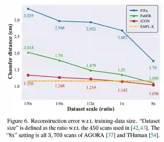 。毕竟 RenderPeople 一个就几百块人民币,实在离谱。仅仅给 1/8 的训练数据(50 个 3D human scan),ICON 重建的质量就可以超过用接近 4000 个训练数据训出来的 PIFu,也超过了用 450 个数据训出来的 PaMIR。作为一个舍弃了 global CNN 的极其 local 的模型,ICON 对训练数据量确实不敏感。而恰恰就是这种钝感,对于提高三维人重建的姿势水平至关重要。