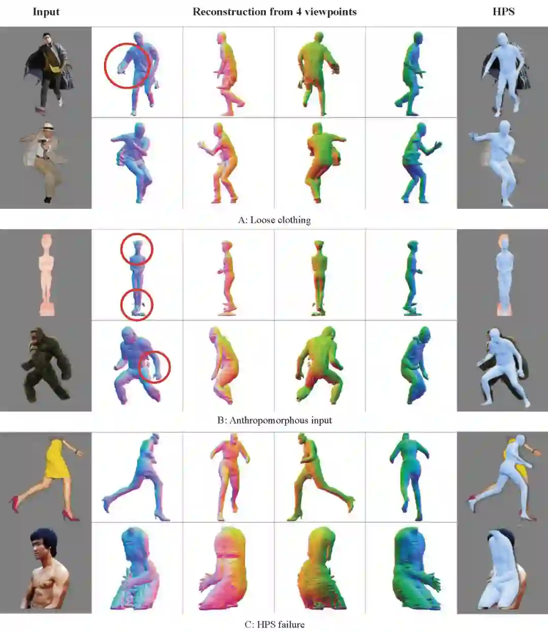 性能天花板受制于 HPS。重建结果受 SMPL 准确性影响极大,SMPL-Normal 的迭代优化,并不能彻底解决严重的姿势估计错误。ICON 现在支持 PyMAF[18]、PARE[19] 以及 PIXIE[20] 三种 HPS,PARE 对遮挡好一些。PIXIE 手和脸准一些,PyMAF 最稳定,但依旧对一些很难的 case 束手无策。所以,尽管 HPS 已经做得很多了,围绕各种 corner case 每年能出数百篇论文,但我们依然不能说这个问题解决了,也不能说这个问题没有价值了。至少,对于 ICON 而言,HPS 的准确度是一切的基础,HPS 挂了,再怎么迭代优化也没用;