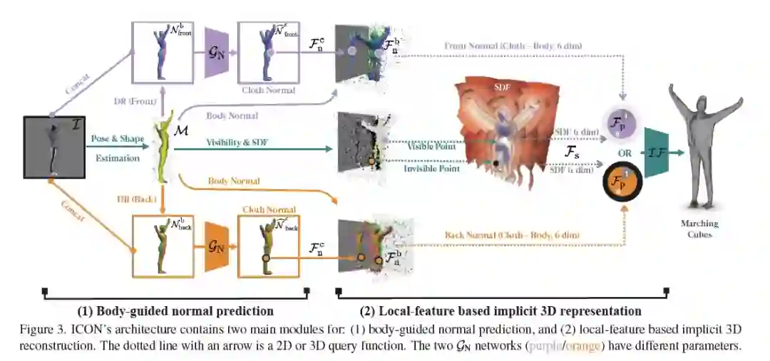 。先从图像中预测 SMPL body,渲染出正反 body normal,与原始图像合并起来,过一个法向预测网络,出正反 clothed normal。然后对于三维空间中的点,clothed normal 取三维,body normal 上取三维(注意,这里是从 SMPL mesh 上用最近邻取的,而不是从 body normal image 中取的),SDF 取一维,一共七维,直接扔进 implict MLP,Marching Cube 取一下 0.5 level-set 等值面。