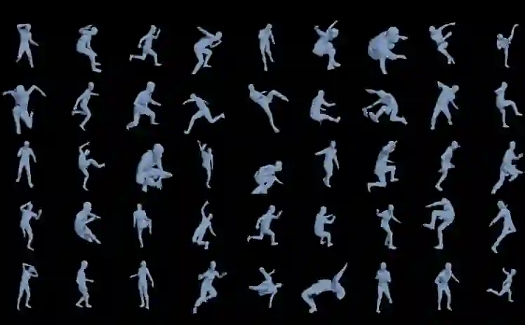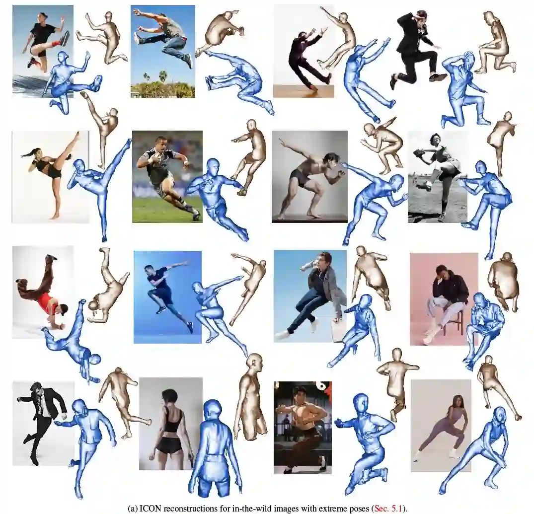 为了充分测试 ICON 在非常难的姿势上是什么水平,我从 pinterest 上找了一些动作非常离谱的图片,武术、跑酷、舞蹈以及体育等等。总之,这些动作从未出现在训练集中,也不可能成为训练集(动作转瞬即逝,没法稳定住用仪器进行扫描捕捉)。但结果是令人欣慰的,尽管不完美,但至少还是个人形。