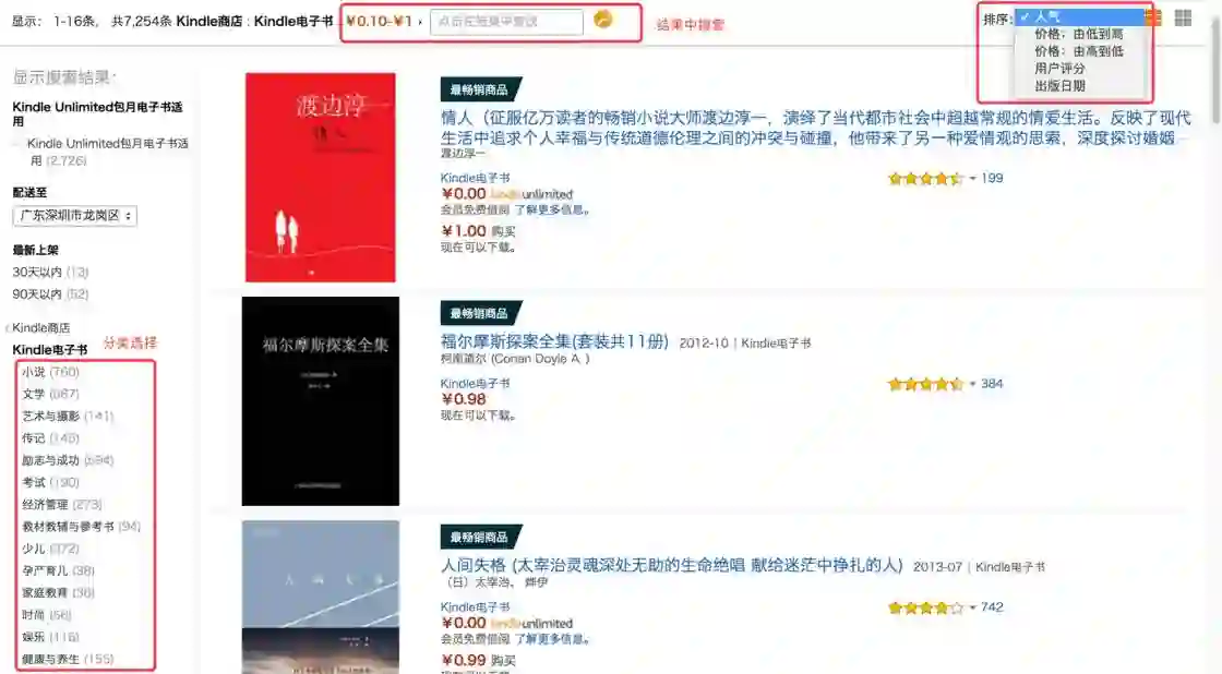 0.1 到 1 元的书 显示筛选出亚马逊 Kindle 商店价格区间在 0.1 元到 1 元的图书,我们可以按照人气、价格和出版日期排序,还可以针对性在结果中搜索,选择分类等。这个价格区间的大部分应该是可以接受的。